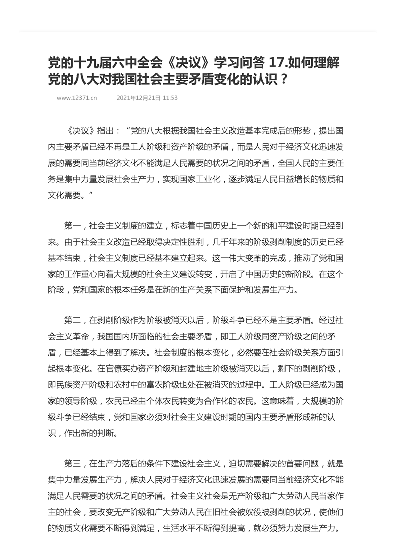 党的十九届六中全会《决议》学习问答 17.如何理解党的八大对我国社会主要矛盾变化的认识?
