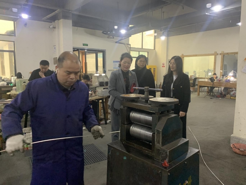 经贸管理系讯 (通讯员 成丽平)2024年4月8日,为了更好推动一体化教学改革,探索人才培养新模式,也为了更好对接湖南省第四届教师职业能力大赛,系部骨干老师代表在系党支部书记周素萍的带领下赴郴州九乐电子商务有限公司进行参观学习。该公司是一家集设计、生产、销售和白银文化推广、手工技艺研习为一体的综合性电子商务企业,九乐“高记手工银”是湖南省级非遗传承项目,湖南省互联网+白银重点孵化企业,湖南省数字商务协会理事单位,郴州文旅商品协会理事单位!
