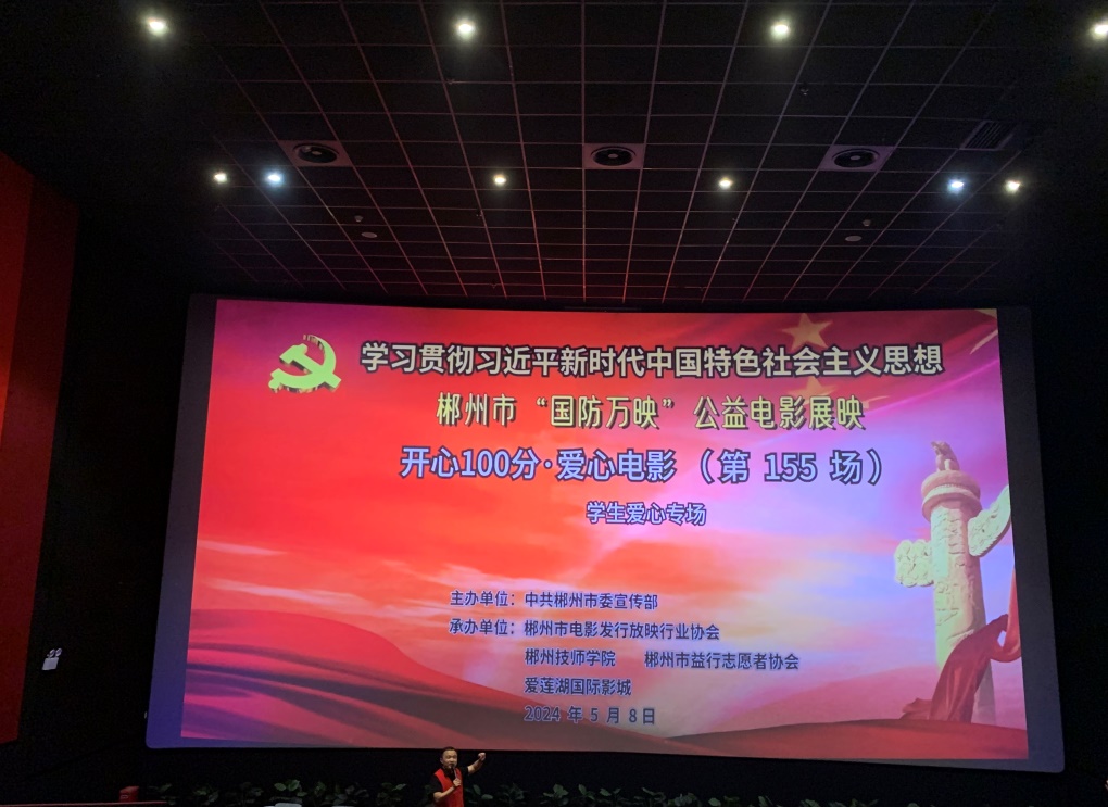 经贸管理系讯 (通讯员 许媛) 为进一步加强爱国主义教育,激发广大党员、干部爱国主义热情,凝聚奋进新时代的磅礴力量,提升学生思想道德素质,丰富校园文化生活,经贸管理系开展“爱国主义”教育观影活动。系党员教师代表、学生干部代表、学生工作处党员教师代表共计90余人,于5月8日下午参加由中共郴州市委宣传部主办,郴州市电影发行放映行业协会、郴州市益行志愿者协会、爱莲湖国际影城承办的郴州市“国防万映”公益电影展映活动。